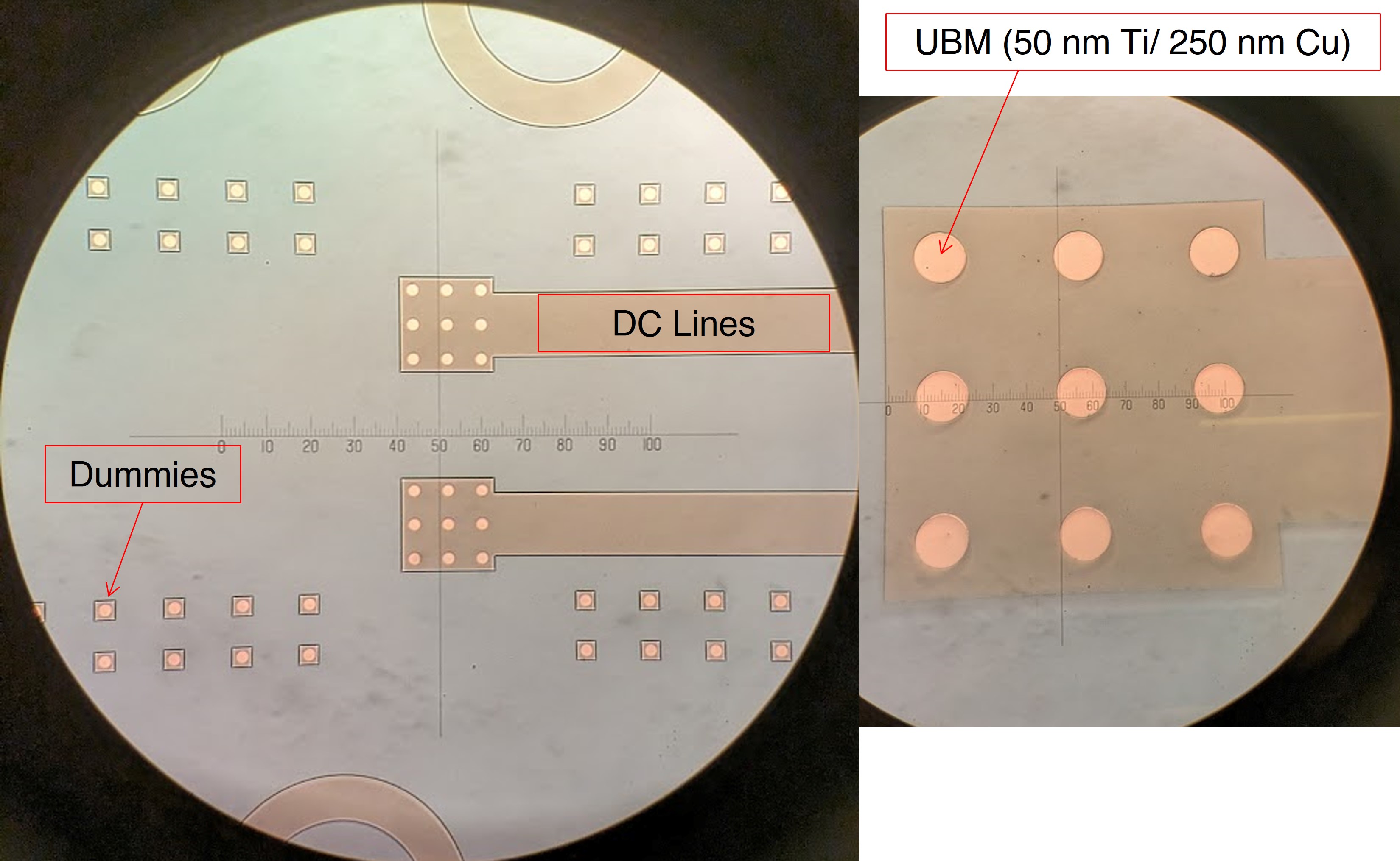 - Indium bumps were electroplated at predefined contact pads on Nb and NbN DC lines using a pulsed DC electroplating process with a Ti/Cu seed layer for conductivity and adhesion.