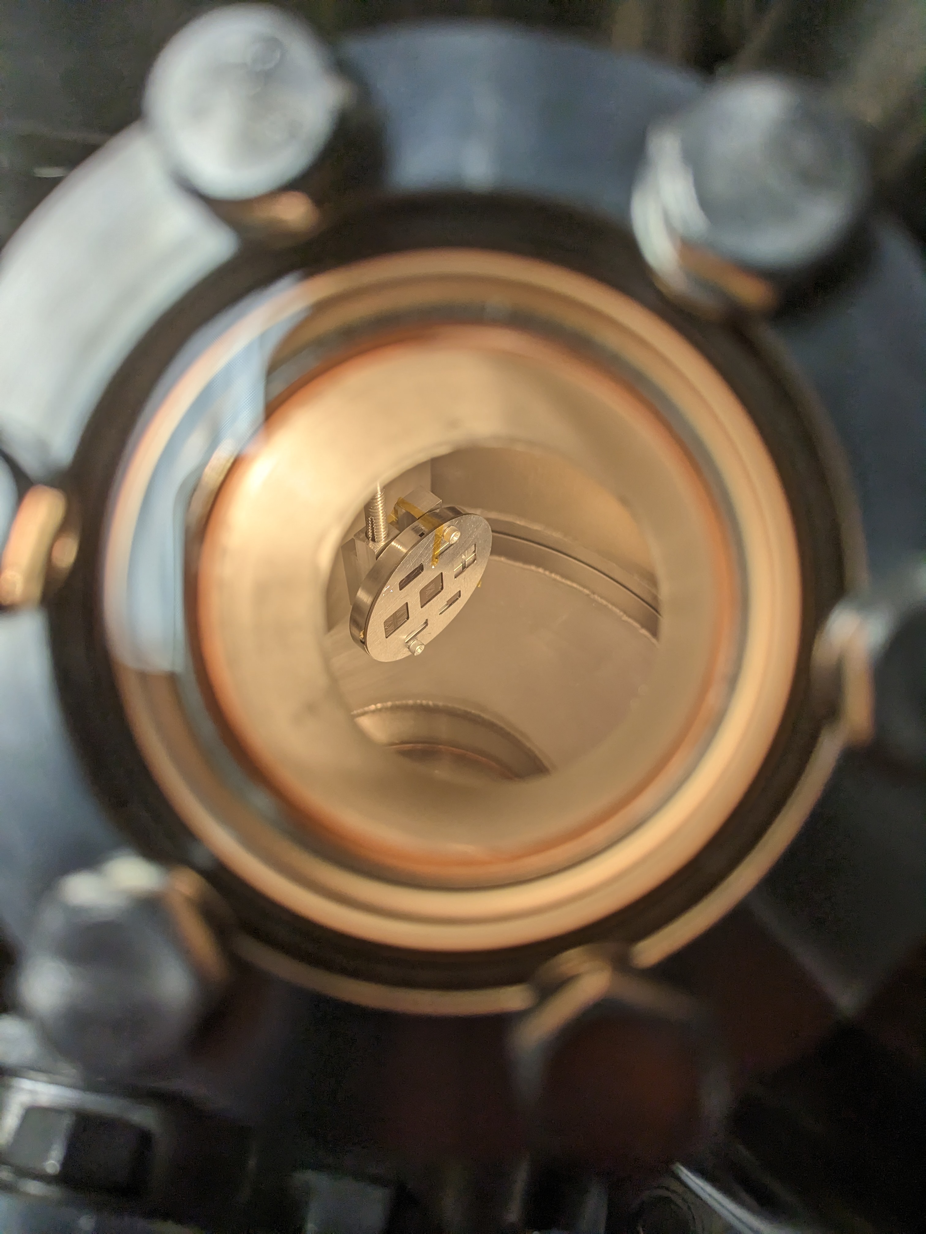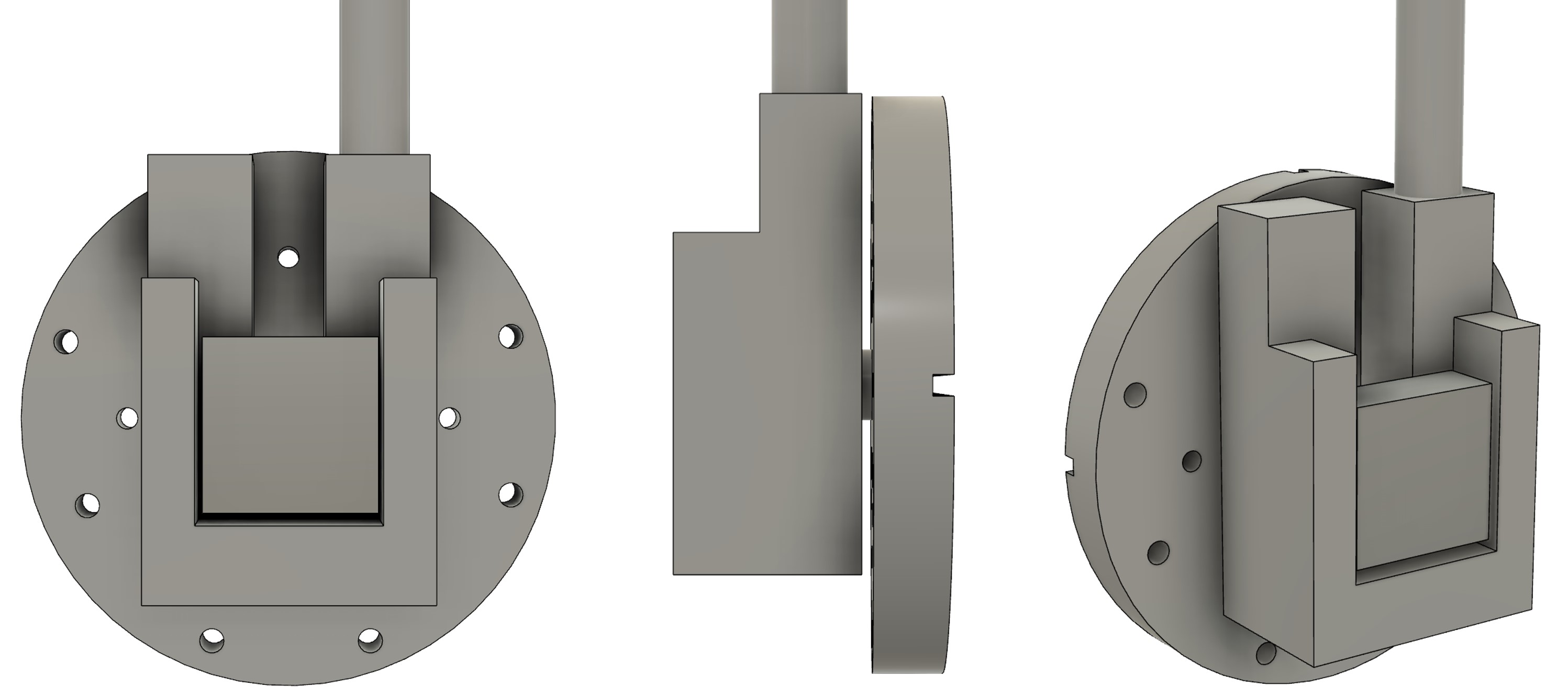 Custom sample holders: Left – CAD model in Fusion 360; Right – installed in the vacuum chamber.